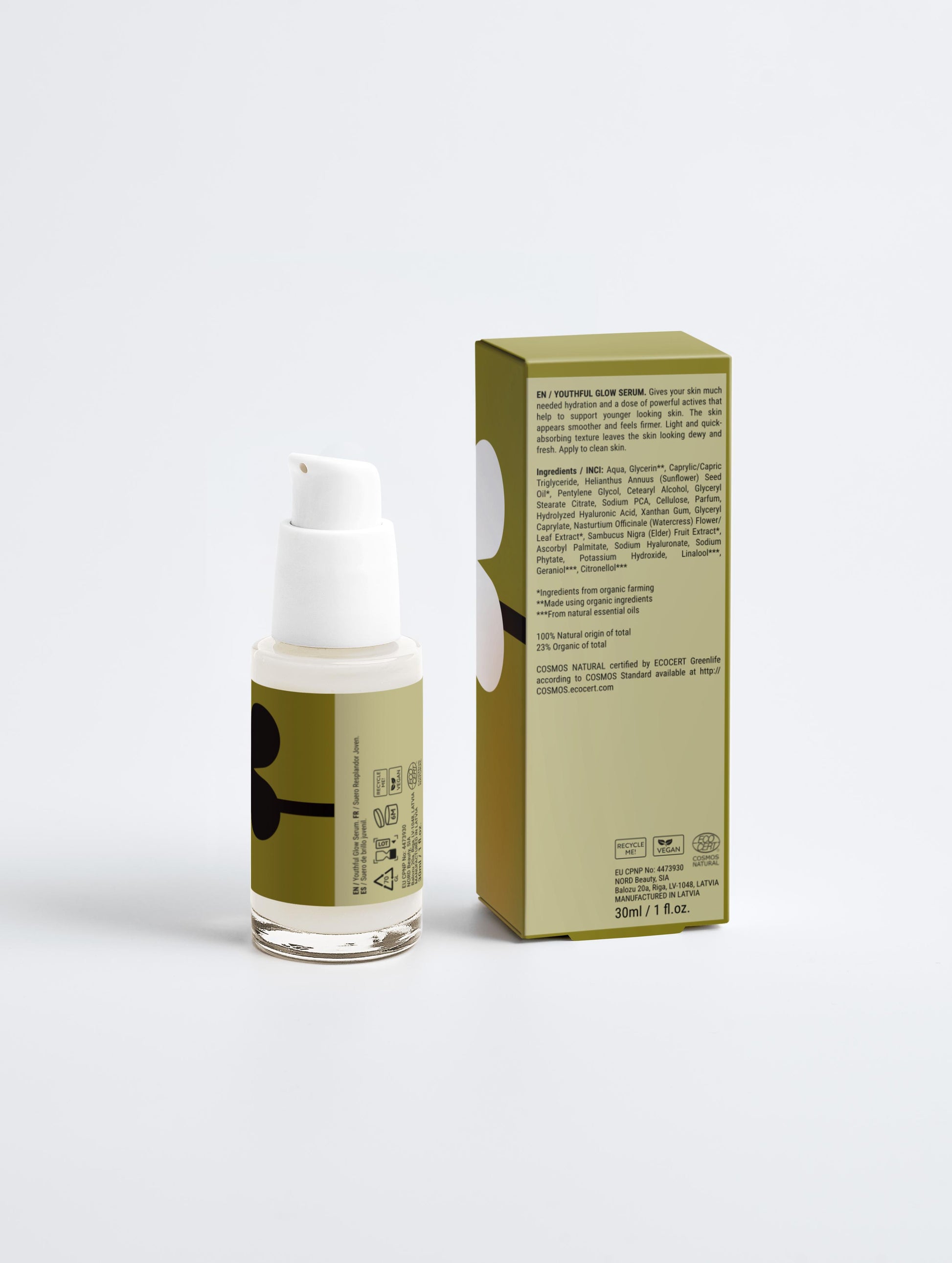 Ingredients / INCI: Aqua, Glycerin➁, Caprylic/Capric Triglyceride, Helianthus Annuus (Sunflower) Seed Oil➀, Pentylene Glycol, Cetearyl Alcohol, Glyceryl Stearate Citrate, Sodium PCA, Cellulose, Parfum, Hydrolyzed Hyaluronic Acid, Xanthan Gum, Glyceryl Caprylate, Nasturtium Officinale (Watercress) Flower/Leaf Extract➀, Sambucus Nigra (Elder) Fruit Extract➀, Ascorbyl Palmitate, Sodium Hyaluronate, Sodium Phytate, Potassium Hydroxide, Linalool➂, Geraniol➂, Citronellol➂